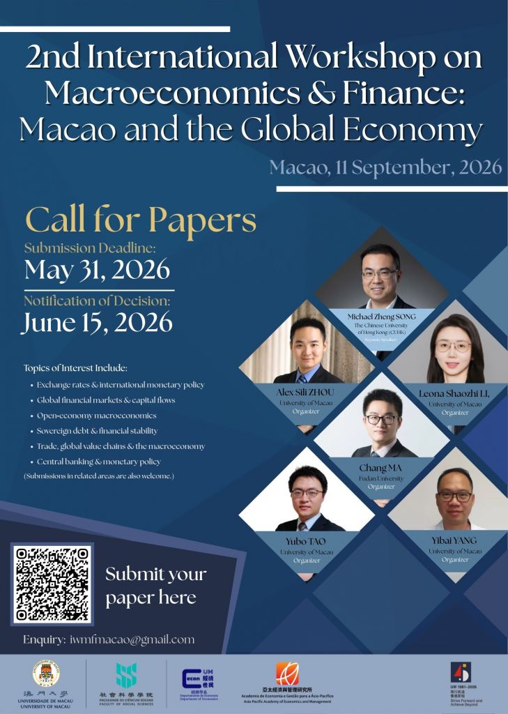 The Asia-Pacific Academy of Economics and Management and the Department of Economics, University of Macau, will organize the 2nd International Workshop on Macroeconomics and Finance: Macao and the Global Economy in Macao in September 2026.
