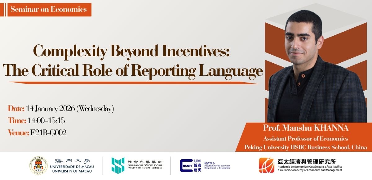 brunakuan Kuan Sok Ian2026-01-13T10:43:43+08:00“Complexity Beyond Incentives: The Critical Role of Reporting Language” Speaker: Prof. Manshu KHANNA Assistant Professor of Economics Peking University HSBC Business School, China Date: 14 January, 2026 (Wednesday) Time: 14:00-15:15 Language: English Venue: E21B-G002