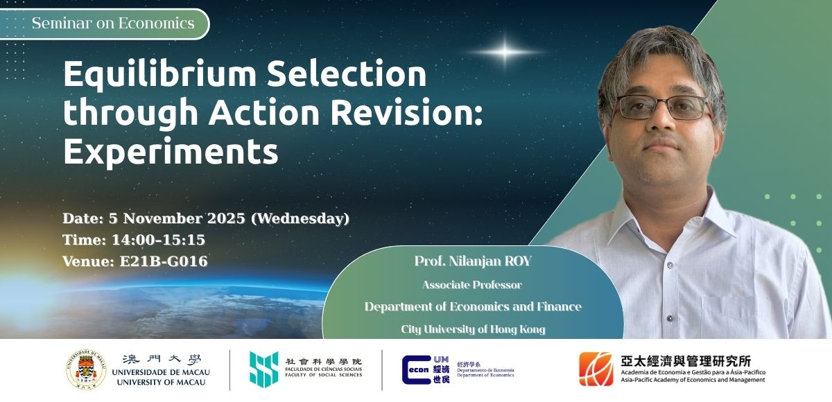 “Equilibrium Selection through Action Revision: Experiments” Speaker: Prof. Prof. Nilanjan ROY Assistant Professor Department of Economics and Finance City University of Hong Kong Date: 5 November, 2025 (Wednesday) Time: 14:00-15:15 Language: English Venue: E21B-G016