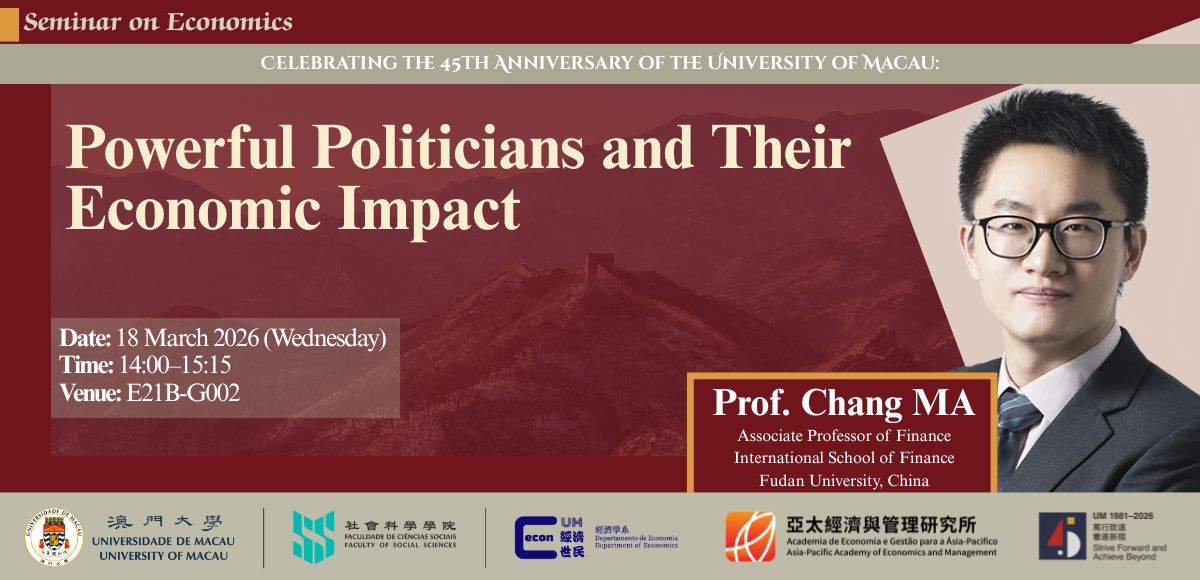 “Celebrating the 45th Anniversary of the University of Macau: Powerful Politicians and Their Economic Impact” Speaker: Prof. Chang MA Associate Professor of Finance International School of Finance Fudan University, China Date: 18 March, 2026 (Wednesday) Time: 14:00-15:15 Language: English Venue: E21B-G002